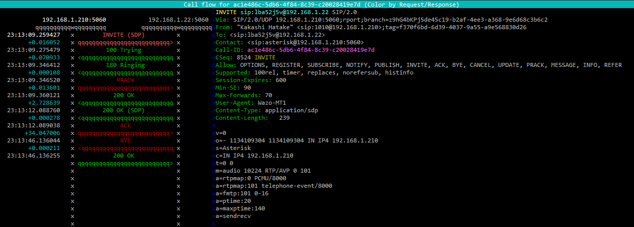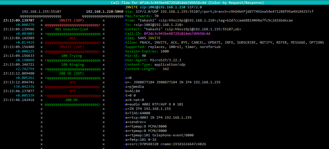 On voit bien l'origine de l'appel qui est Kakashi avec en IP source 192.168.1.155 en destination de notre PBX. Ensuite, il y a les échanges SIP (prochain épisode en détail).