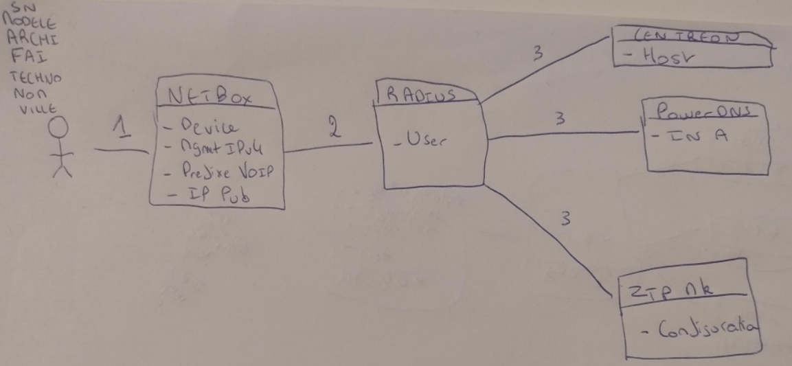 Grosso modo, je souhaite qu'un utilisateur (plus tard notre CRM) envoie une requête HTTP à mon API avec certaines données json (le nom, la ville, la techno, etc). Ensuite, c'est cette API qui va contacter toute mon infra en commençant par Netbox puis mon radius puis Centreon/PowerDNS/ZTP Mikrotik.