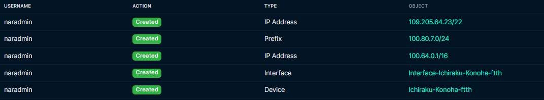 | Résever l'IPv4 WAN | IpamAPI.IpamPrefixesAvailableIpsCreate(ctx, prefixID).IPAddressRequest([]netbox.IPAddressRequest{IPRequest}) |