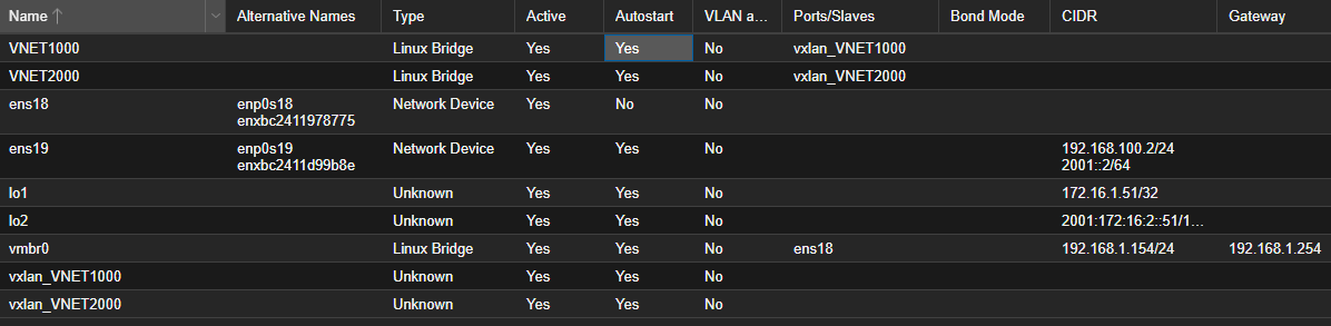 Utilisant la version 9 de proxmox, on a accès au SDN intégré en GUI. Cependant, je le trouve assez limité (si ce n'est inutile) quand il s'agit de relier le cluster à une fabric externe (comme ma fabric Arista). J'ai l'impression qu'ils ont pensé au SDN que pour les membres d'un cluster Proxmox.