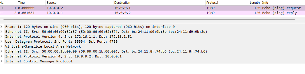 Rien de nouveau, on observe bien l'entête VXLAN entre nos deux VTEPs :