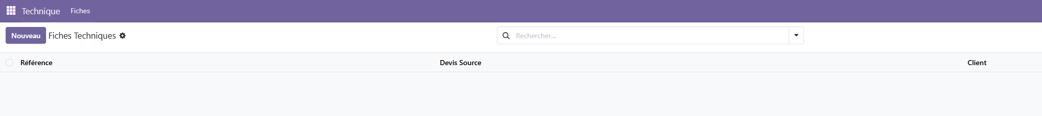 Dedans, on peut voir toutes les fiches techniques déjà créées. On peut aussi rechercher par la référence, le devis ou le client :
