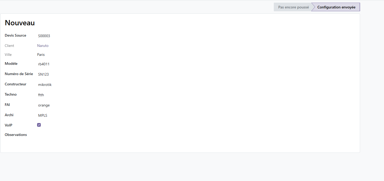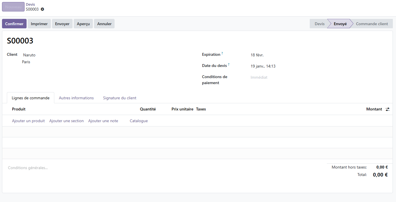 Ici le devis S0003 a été crée et envoyé au client Naruto pour la ville de Paris.