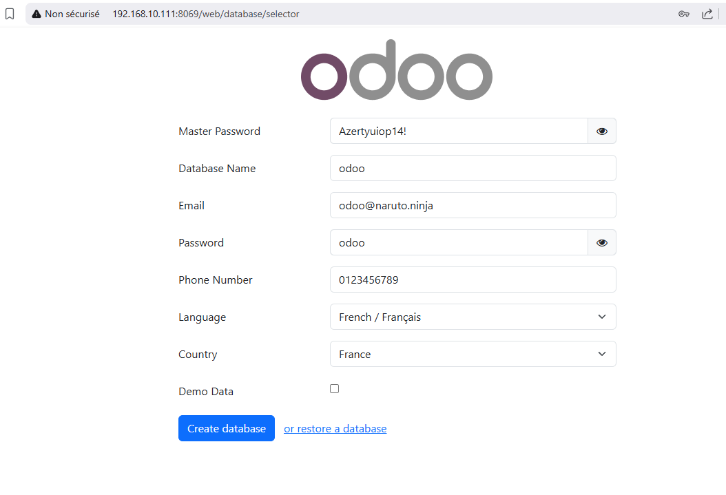 Pour finir, je remplis le fichier de configuration /etc/odoo.conf avec mes informations :