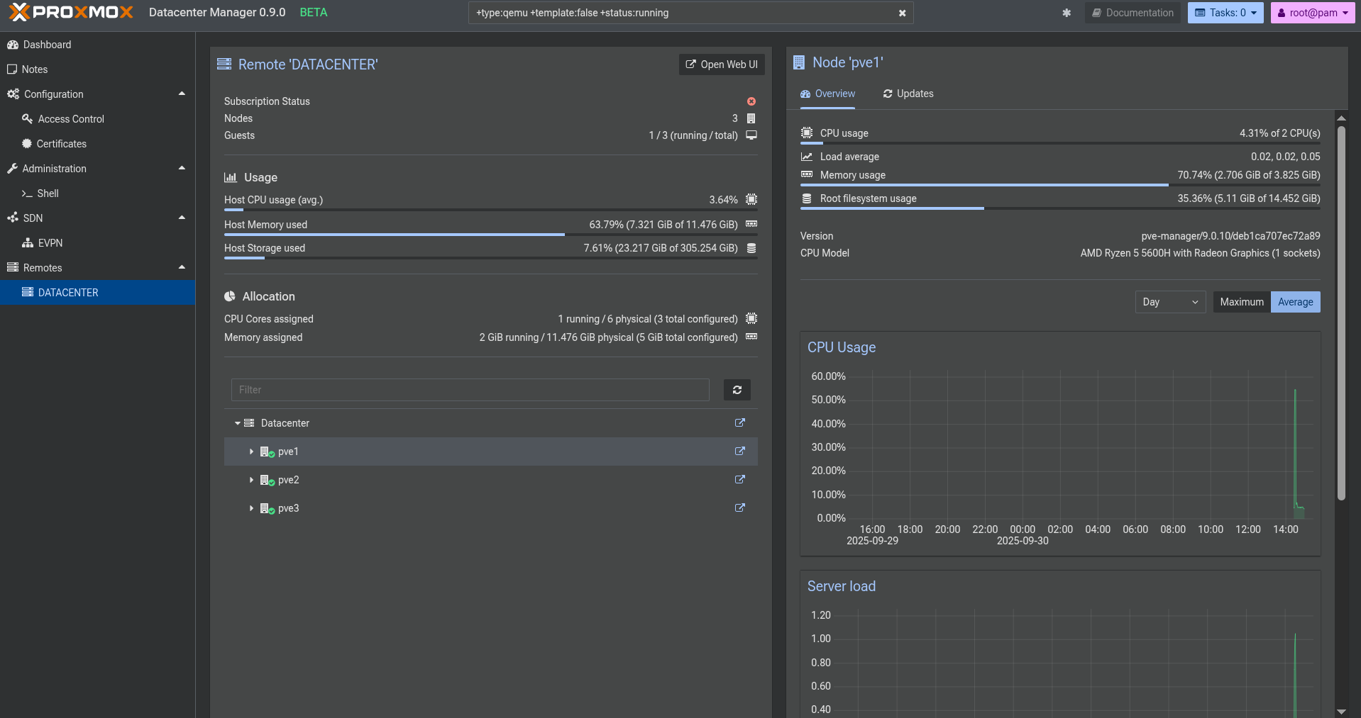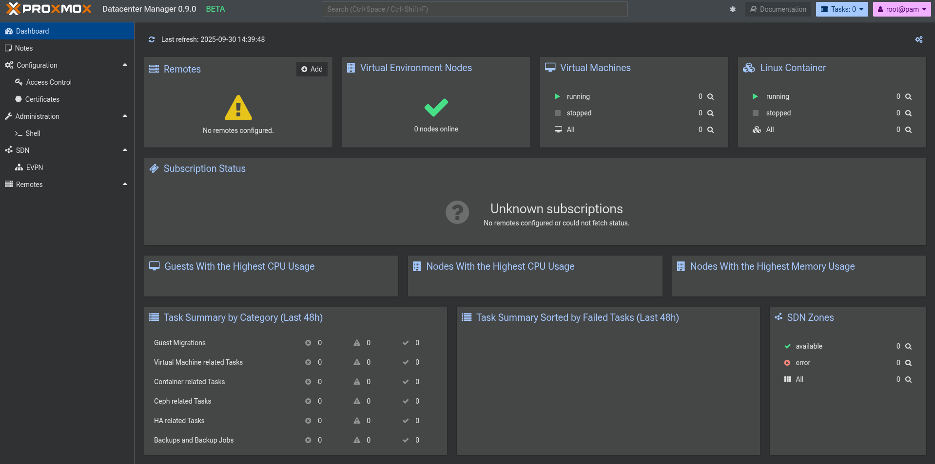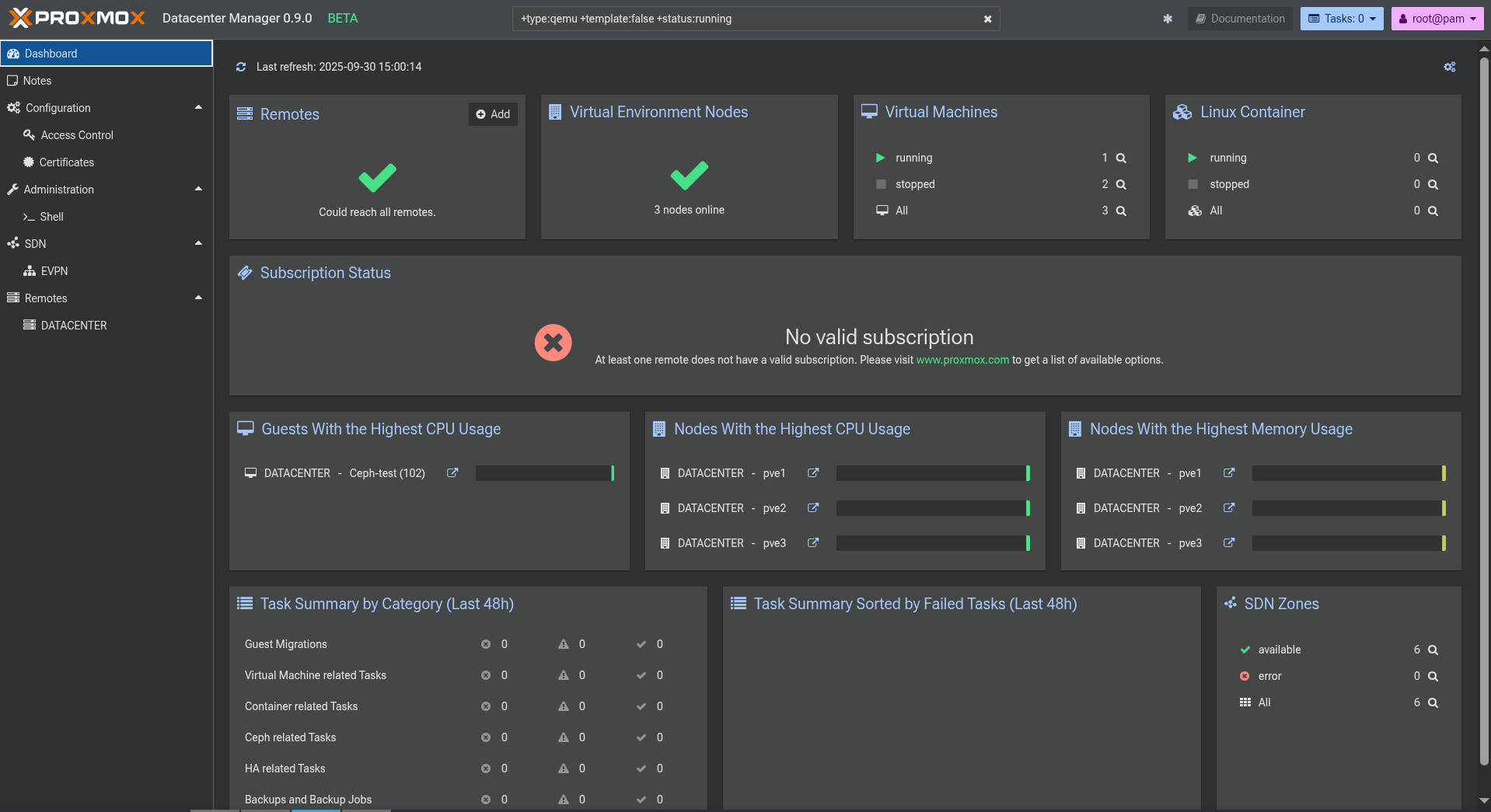 Proxmox Datacenter Manager semble être un bon outil mais pas encore assez développé pour qu'il y ait une quelconque intérêt à l'heure actuelle pour moi. J'aimerai bien créer des interfaces, avoir accès au VXLAN dans le SDN, avoir une API qui permet de créer des VM sur le node le moins chargé, etc. Encore en bêta donc il faut attendre !