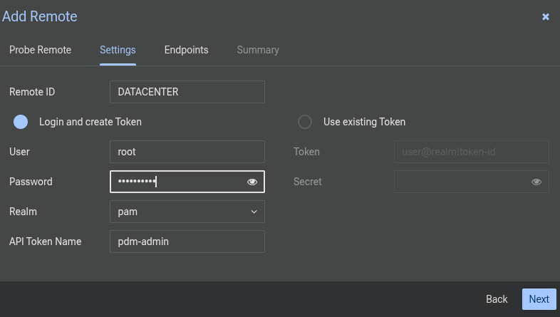 Puis on renseigne un nom et le login/password. On pourrait très bien utiliser un token pour que PDM tape les PVE via API :