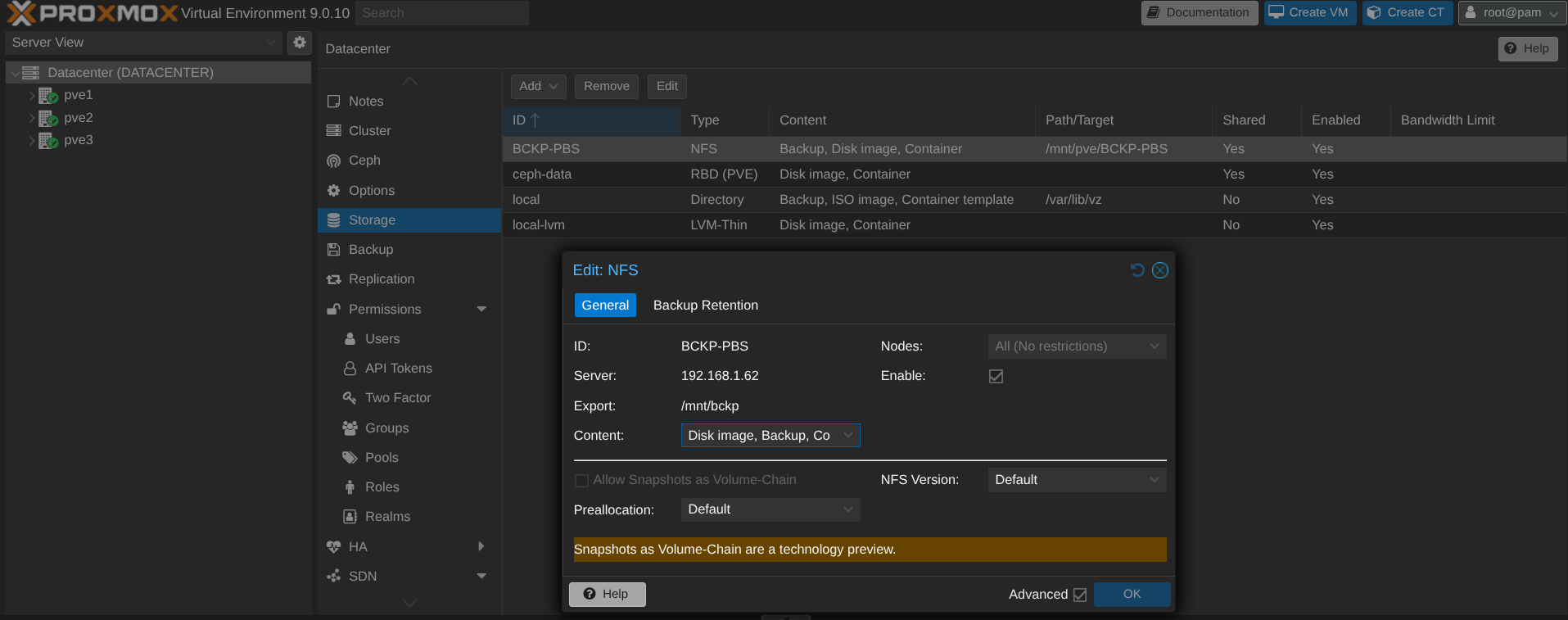 Comme pour PDM, on se base sur l'ISO fournie par proxmox 😄 Le PBS est une VM hébergé sur le cluster avec en stockage, un partage de fichier NFS sur un serveur dédié. Pour ce faire, on ajoute un nouveau storage NFS :