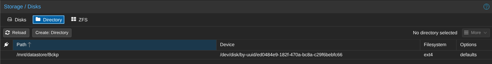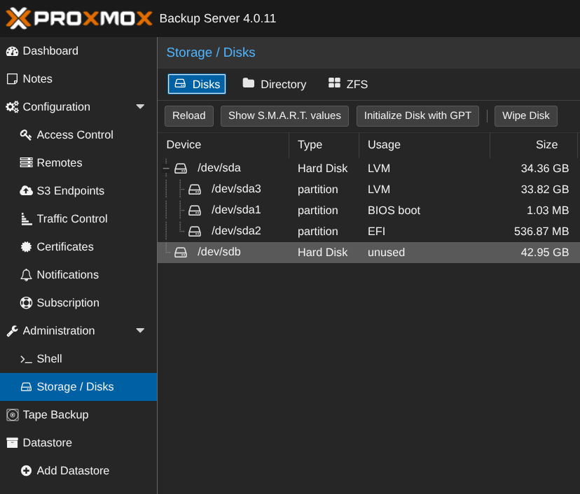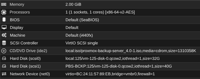 Sur mon PBS, j'ai donc un disque pour l'OS et un disque qui est dédié pour les backups des VM qui iront sur le serveur de partage de fichier NFS :
