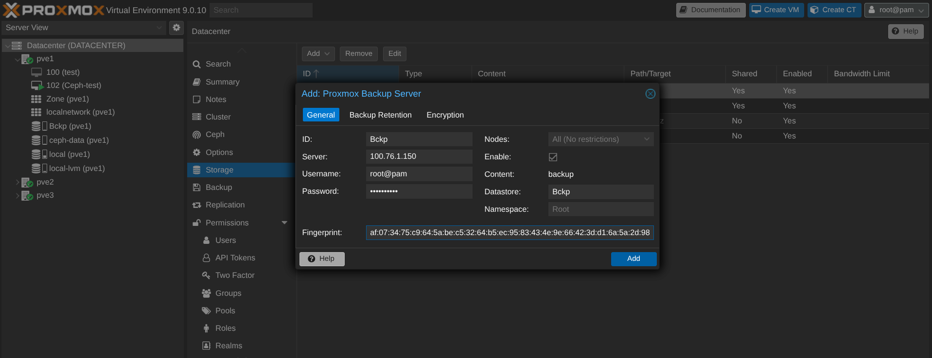 Retournons sur le cluster. Maintenant, il faut lier le PBS aux PVE. Pour ce faire, on crée un storage Proxmox Backup Server avec un nom / IP du PBS / Login+MDP / Nom du datastore / Fingerprint du PBS :