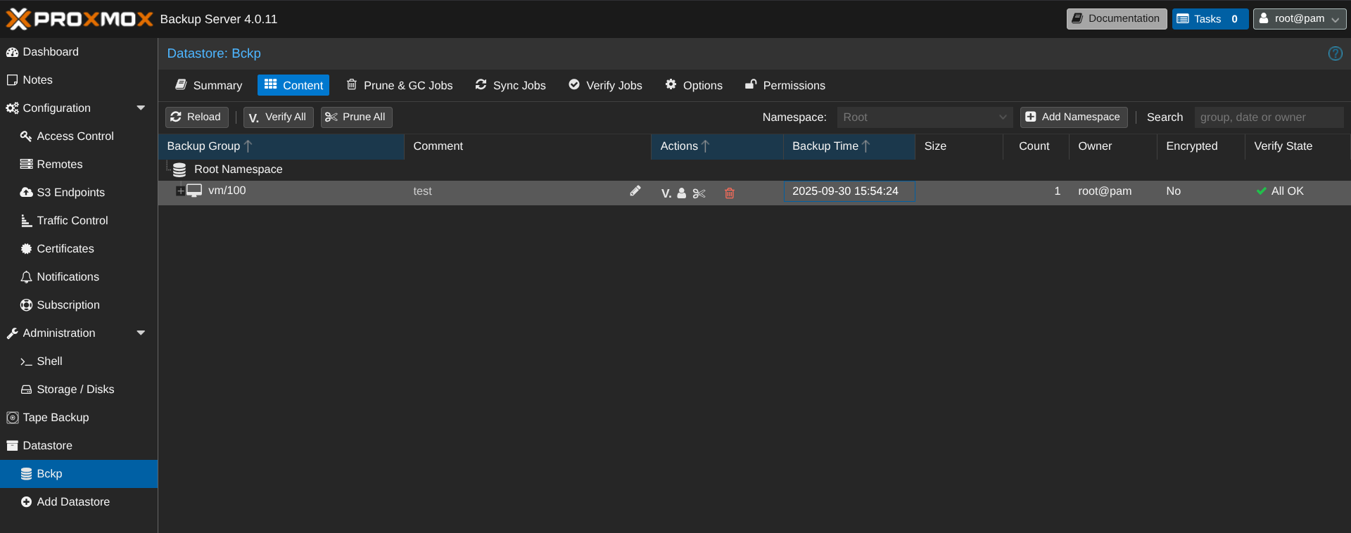 Pour aller plus vite, j'ai fait un run now sur le job qui permet de lancer le backup tout de suite. Sur PBS, on peut voir que le job est bien en vert :